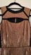 Stunning cocktail dress with shimmering gold sequins. Features black accents for a bold contrast. Mesh under the arms on the sides (see photo). Fitted to the body. Keyhole back design. Oval cutout in the front bust area. Perfect evening wear that’s striking, sexy, and classy.