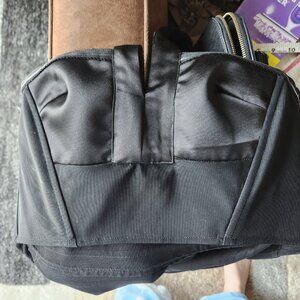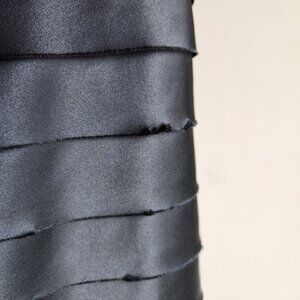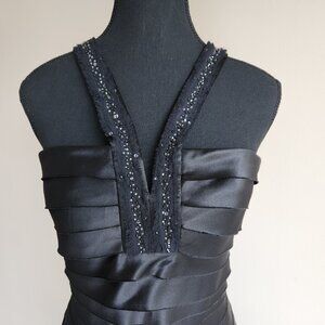 Black bandage raw-hem dress with beaded v-neck and tied halter neck. The dress has a boned bodice for support. Zip-up back.
