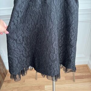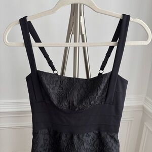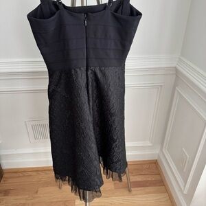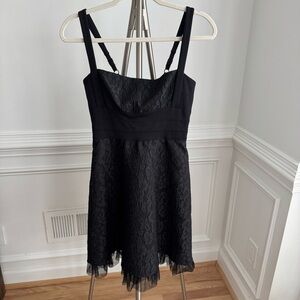 EUC BCBGMaxAzria elegant cocktail black mini dress, tulle hem detail, lace jacquard design look, adjustable straps. Size 6.