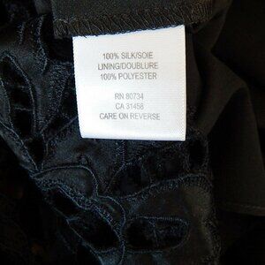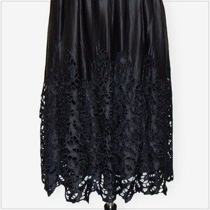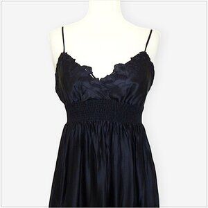 DETAILS: BCBG dress is fully lined. Pull on empire waist slip dress style with adjustable spaghetti straps. Stretch smocked waist. Embroidered cutwork lace detailing. Black silk fabric.