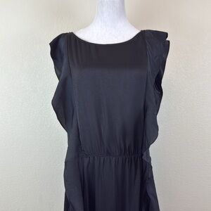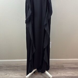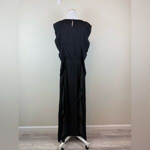 This stunning black gown by BCBGMaxAzria features a sleeveless design with a scoop neckline, perfect for cocktail events or a night out. The dress boasts a fitted bodice that gracefully transitions into a flowing maxi skirt, offering an elegant and timeless silhouette.