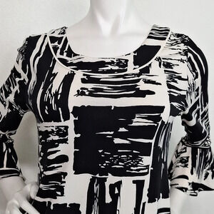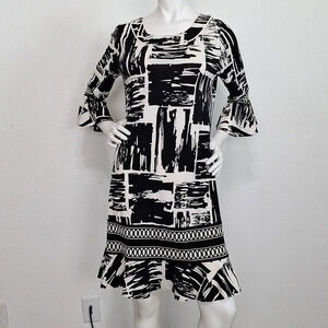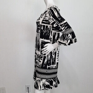 BCBGMaxAzria Black White Retro Abstract Print Bell Sleeve Bohemian Dress Size M