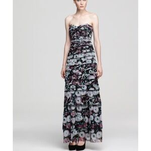 BCBGMaxAzria Black and Purple Patterned Layered Strapless Maxi Gown - 0