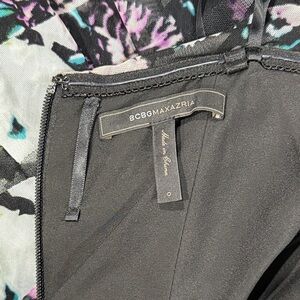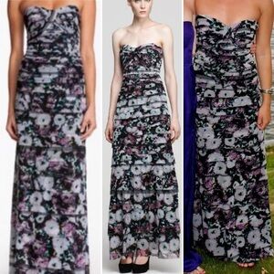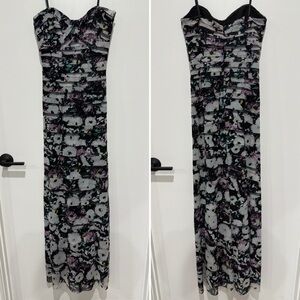 BCBGMaxAzria Black and Purple Patterned Layered Strapless Maxi Gown in size 0. 53 inch length. New condition. Fabric has some stretch. No leg slit. No flaws or signs of use. Please refer to photos for exact size, details, and condition.