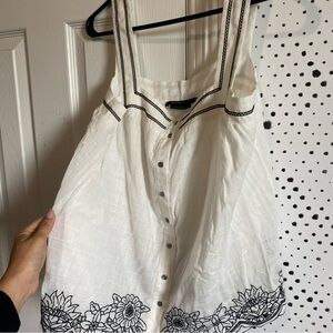 This BCBGMaxAzria tank top showcases a relaxed fit with a white body and intricate black embroidery along the hem. The sleeveless design and airy fabric ensure comfort and style, making it a versatile addition to any wardrobe. Excellent condition