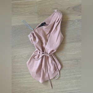 Stylish one-shoulder peach top featuring a tie belt. Perfect for casual outings.