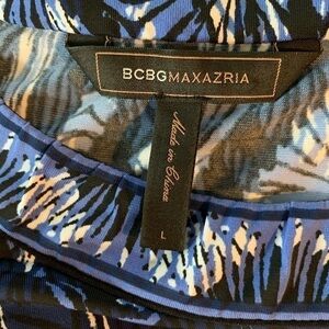The pictures do not do the color blue of this BCBGMaxAzria tunic dress any justice! Not only is it a stunning color, but it's a jersey stretchy fabric that makes it fit so well. Sadly the care/material tag has been cut out. But I’m guessing it's a polyester/spandex blend and is likely gentle cycle machine washable. This is a steal for this brand! Other than the tag missing, you'd never know it wasn't new. In excellent condition. 21" pit to pit, 35" length, 13" sleeve.