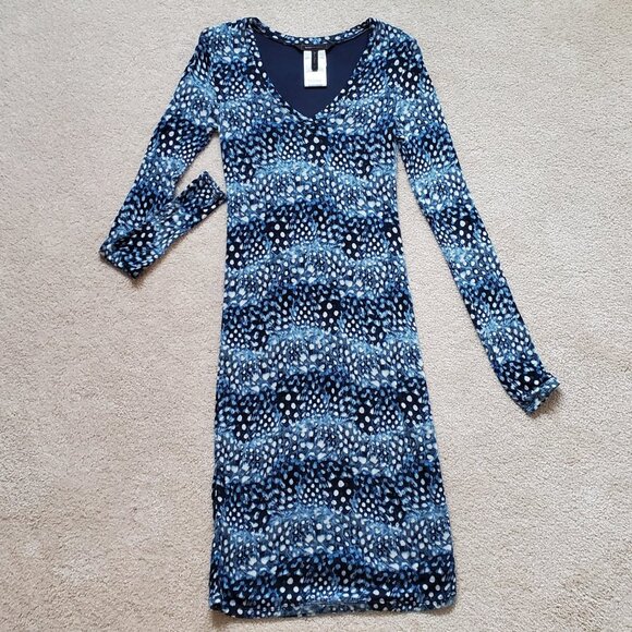 BCBGMaxAzria elegant, feminine and classy dress. Both the body and the lining are made of 95% modal and 5% spandex, very delicate and lightweight, almost see through, with white dot-like prints. Bodycon silhouette and slit design. V-neck. Long sleeves. Very versatile, can be worn at work and fancy enough to go to formal dinner. Hand wash cold water. Pre-owned, excellent condition. Sleeves length: 27 in. length: 40 in.