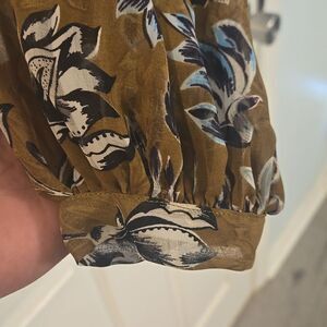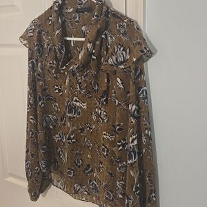 This elegant long sleeve blouse from BCBGMaxAzria showcases a rich brown hue complemented by a striking ruffled bib collar. The relaxed fit and intricate floral pattern make it a perfect choice for both casual and dressy occasions.