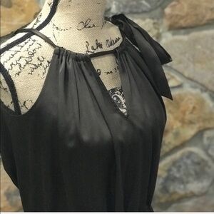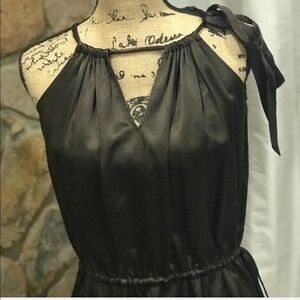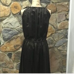 Elegant black midi dress with a halter neckline. Features a tie detail on the shoulder. Perfect for evening wear.