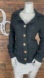 Chic chunky knit black sweater with intricate carved wooden buttons. Features a wide collar with notched lapels and front pockets. Long sleeves with rolled cuffs. Perfect for layering.