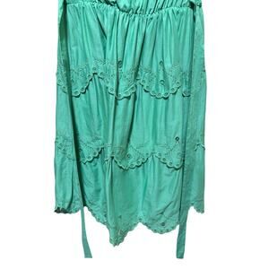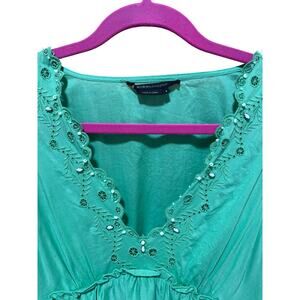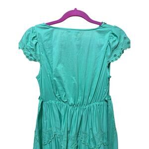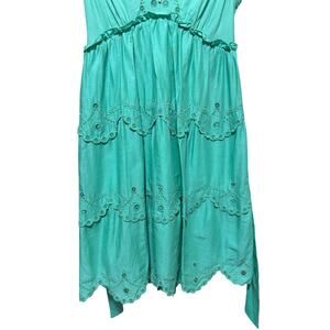 Effortlessly romantic and timelessly chic, this BCBGMaxAzria cotton sundress is a beautiful blend of boho and feminine style. Crafted from 100% breathable cotton in a soft celadon green, it features intricate embroidered eyelet detailing, subtle gemstone accents at the neckline, and a flattering empire waist with adjustable tie and stretch elastic back for a perfect fit.