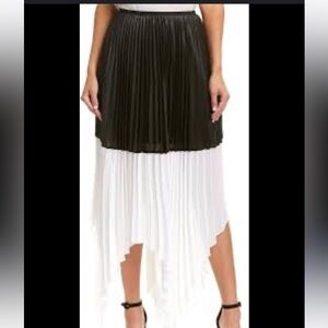 This elegant maxi skirt by BCBGMaxAzria showcases a striking black and white color-block design, perfect for casual or resort wear. The asymmetrical, high-low hemline and pleated texture create a graceful flow, enhancing its lightweight fabric. Ideal for making a stylish statement, this skirt moves beautifully with every step.