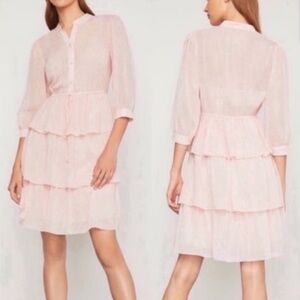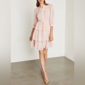 BCBGMaxAzria Clip Dot Tiered Ruffle Dress in color “Rose Smoke” a light pink