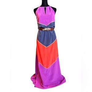 Stylish maxi dress with halter neck. Features striking purple, red, and blue chevron pattern. Ideal for bold fashion statements.