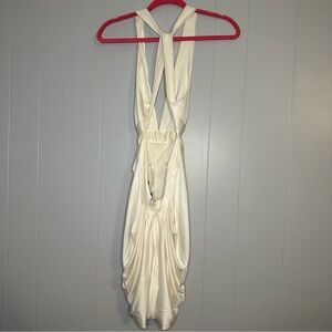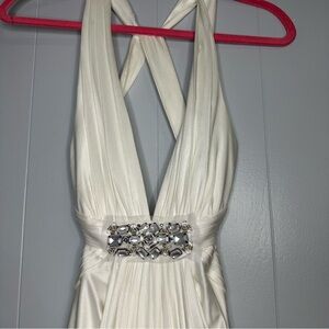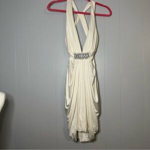 Stunning BCBGMAXAZRIA halter-style cocktail dress in a creamy white satin finish, featuring a plunging neckline, open criss-cross back, and dramatic draped hem. The waist is cinched with a glam rhinestone-jeweled appliqué for that extra sparkle.