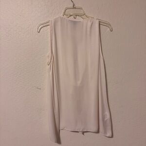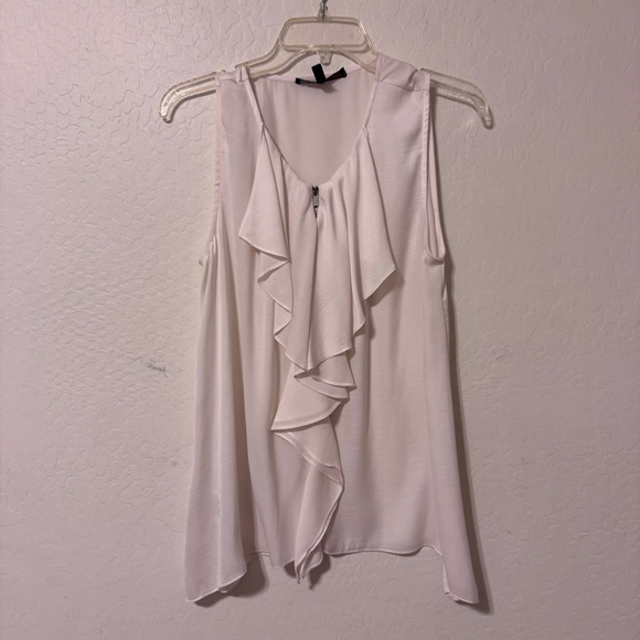 Chic cream blouse with cascading ruffles. Sleeveless design for versatile styling.