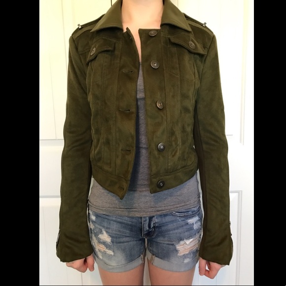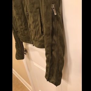 This cropped BCBG jacket has silver fastenings and zippered pockets. The sleeves can be zipped/unzipped to add a little extra room for layers underneath, as well as have the underside made of a stretchy material. The main fabric is a darker velvety green and the collar seems to be made of a lighter green leather. Barely worn and in virtually perfect condition!