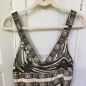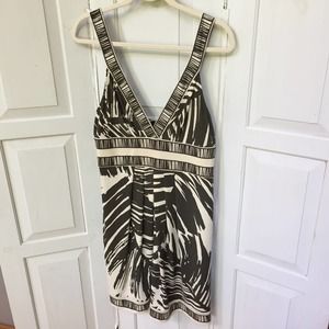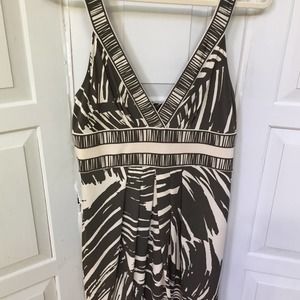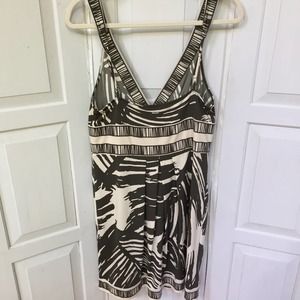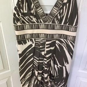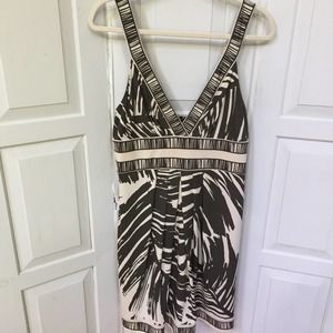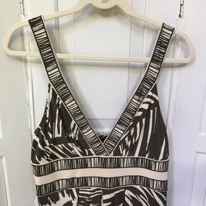 BCBGMaxAria brown (with gray undertones) and beige dress. V-neckline with adjustable straps and empire waistline. Pleating at waistline in front and back.
