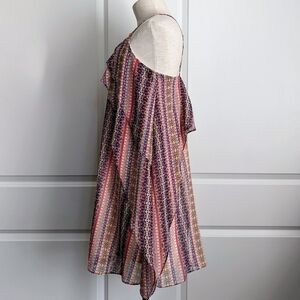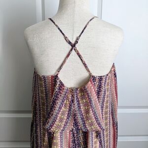 Casual, cool, and summer stylish! Halter neckline with crossed adjustable spaghetti straps at back. Pullover sheath style. Ruffle detail runs from neckline to hem along sides front and back. Lined.