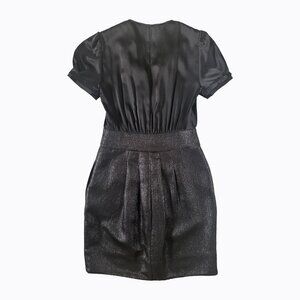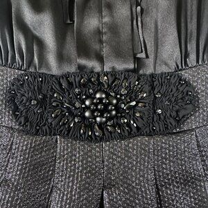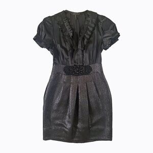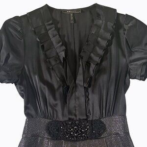 BCBGMaxAzria Dress Sz 4 Black Silk Metallic Ruffle V-Neck Embellished Waist Y2K