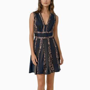 Turn heads with this stunning A-line mini dress by BCBGMaxAzria. Featuring bold faux leather that is contrasted by delicate floral lace paneling, this dress perfectly blends edgy sophistication with romantic charm.