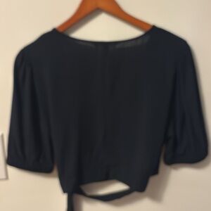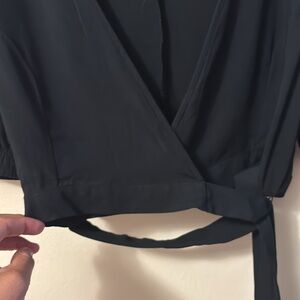 Chic black wrap blouse by BCBGMaxAzria. Features puff sleeves and a tie waist. Perfect for versatile styling.
