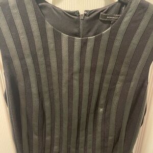 This sophisticated BCBGMaxAzria dress features a sleek gray sheath design, perfect for cocktail or work occasions. The sleeveless silhouette is complemented by a classic crew neckline, offering a timeless and elegant look. Crafted with a tailored fit, this midi dress exudes a refined style ideal for any formal setting.