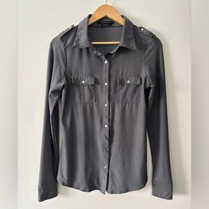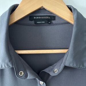 Elevate your wardrobe with this chic gray button-up top from BCBGMaxAzria. Perfect for any occasion, this stylish piece offers both comfort and elegance. Gently used in excellent condition with no rips or stains.