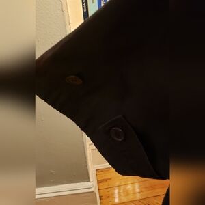 Navy blue, short sleeved jacket with wide collar and two-way zipper. Buttons for tightening sleeves and waist. Cotton and spandex shell, acetate lining.