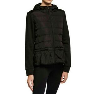 Drawstring hooded neckline. Long sleeves with cuffs. Zip front closure. Two exterior zip pockets. Drawcord at waist. Light polyester fill puffs at exterior front and hood. Sleeves and back are not polyester filled/puffed. Interior back is fleece lined. Fitted style. Lightweight. Unlined peplum-style hem below drawcord at waist.