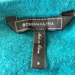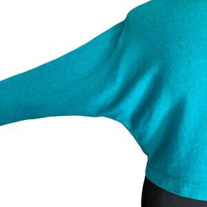 BCBGMAXAZRIA Jewel Green Camille Cropped Sweater Size Small Wool Blend. Dolman sleeves. Cropped length. Crew neck. Ribbed cuffs. Fabric blend is 60% wool, 30% nylon, and 10% cashmere. The color is a teal green.