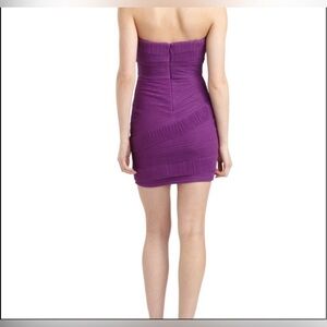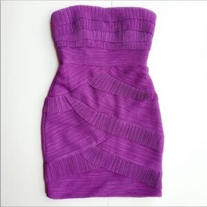 * This stunning bodycon dress by BCBGMaxAzria features a vibrant purple hue and elegant ruched detailing.