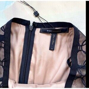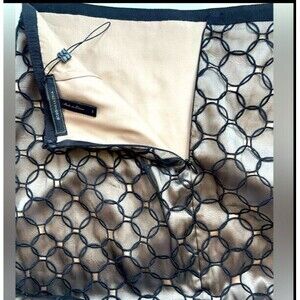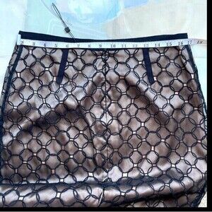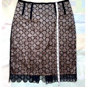 BCBG MaxAzria Lace Eyelet Circles Overlay 100% Silk Black Nude Pencil Skirt 6