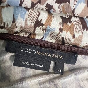 BCBGMaxAzria midi wrap dress in size XS with beautiful shades of blue, white and brown paint brush stroke style print. Pleated cap sleeves. Collar with v-neck line. Super comfy! In excellent condition!