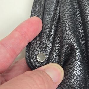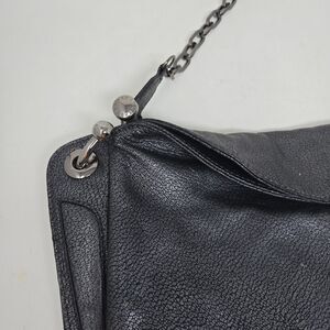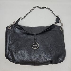 The BCBG MaxAzria Medium Metallic Gray Fern Green Hobo Tote Bag is a stylish and spacious handbag made of leather with a unique dark pewter with a metallic fern green undertone. It features a medium size with a chain handle in a matching pewter gray color, making it easy to carry. The hobo bag style adds a trendy touch to any outfit, while the pewter hardware complements the overall design. With inner pockets for organization and a charming bag charm accessory, this handbag is perfect for women looking for a fashionable and functional accessory.