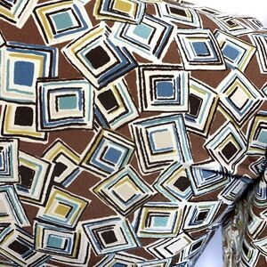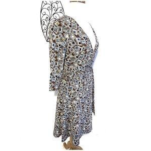 Really cute retro looking polyester/spandex blend midi dress. Three quarter sleeve, deep V neckline with tie belt. Chocolate brown with various colors of boxes. Sewn to look like a wrap around dress