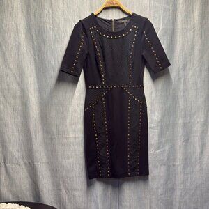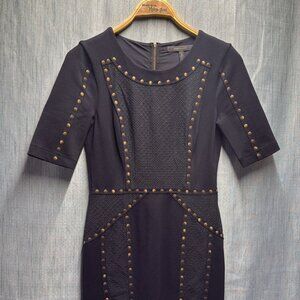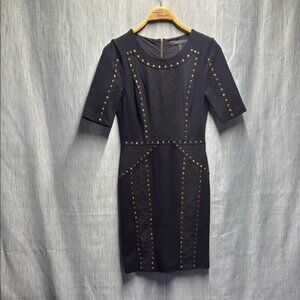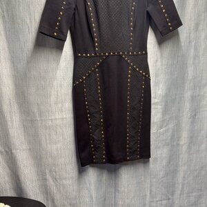 This mini dress in black exudes sophistication with its sleek sheath silhouette and crew neckline. Designed for cocktail events or a night out, it features 3/4 sleeves and striking studded detailing that adds a modern edge to its classic style.