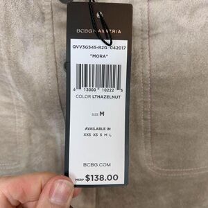 BCBGMaxAzria Mora faux suede mini skirt, button front Elastic waistband, pull-on style Square front pockets Split side seams and slightly high low hemline Light beige/tan Hazelnut color