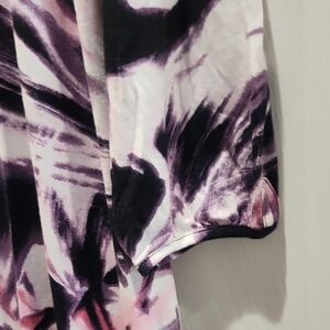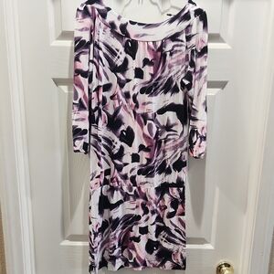 Chic dress with a vibrant abstract pattern. Features a mix of black, pink, and white hues. Ideal for versatile styling.