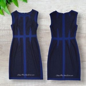 Absolutely stunning NWT BCBGMaxAzria figure flattering blue sheath pencil dress with black lace color block panels. Celeb favorite! Retailed at $248. See photos for measurements. Keep in mind that the flat bust measurement does not accommodate for extra room the bust darting will provide.