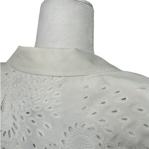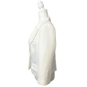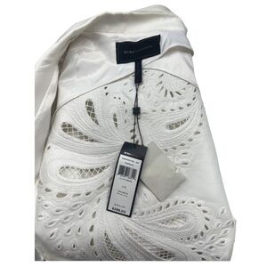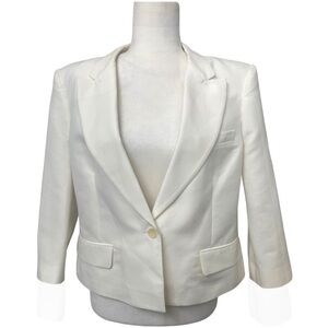 BCBGMaxAzria Natalia White Cropped Lace Back Jacket. Size Large. Gorgeous detail on the back of the jacket. Padded shoulders. There’s a small dirt spot that should come out one cleaned. All pockets are nonfunctional. Jacket is not true white, it’s or of a off white/cream color. Single button jacket. Measurements are in pics, however additional measurements available upon request.