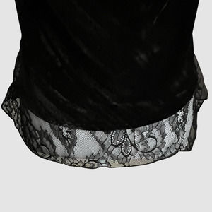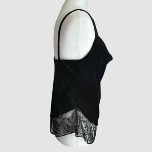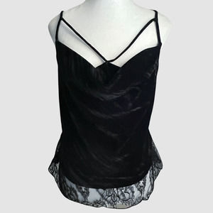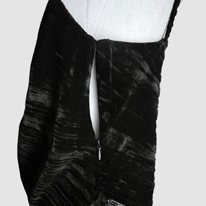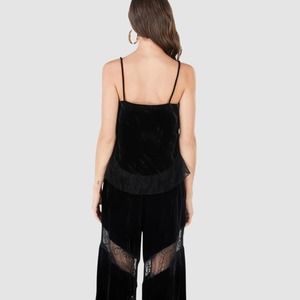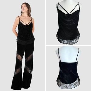 BCBGMaxAzria Nita black velvet top. This top is part of their premium Signature Collection and is crafted from smooth velvet, has a draped silhouette, strappy detailed cowl neck, sheer trim at hemline and concealed side zip closure.