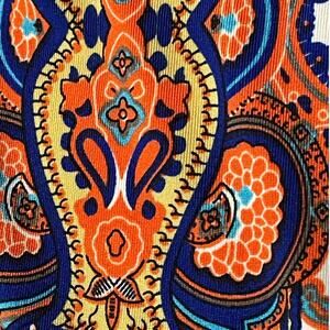 All-over paisley print in shades of orange, blue, and brown on an off-white background.