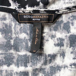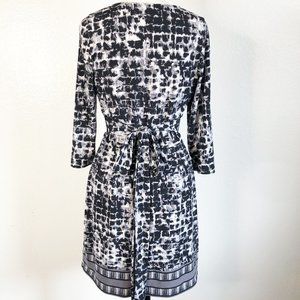 Black, white, and gray brush stroke print surplice dress by BCBGMaxAzria Petites. Faux wrap bodice, tie waist, 3/4 length sleeves, and decorative striped hem. 94% polyester, 6% spandex. Machine wash. Excellent, like new condition except that corner of tag has been slightly cut as shown.