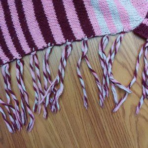 Pink, beige and burgundy striped cozy cardigan with tassels, in good condition. Open front and draping fabric give a poncho-type look. Back length measures 23", back width is 19" armpit to armpit; top of back to bottom of lowest point draping is about 36", shoulder to shoulder is about 15", sleeves about 21". 70% acrylic, 30% wool.