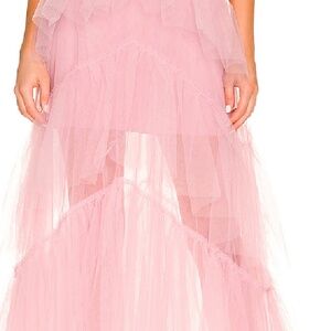 Elegant pink tulle dress. Features a fitted bodice and layered skirt. Perfect for prom.