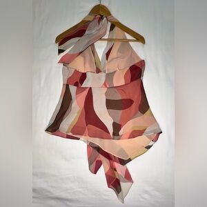 Vintage Y2K silk asymmetrical halter style blouse with abstract pink and brown design. Bought new in early 2000s - it’s been dry cleaned & carefully stored since the least time wearing.