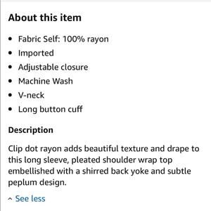 Clip dot rayon adds beautiful texture and drape to this long sleeve, pleated shoulder wrap top embellished with a shirred back yoke and subtle peplum design.
