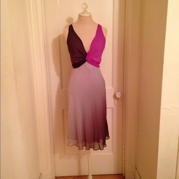 Above the knee length, purple ombré dress from BCBGMaxAzira. Open back and 100% silk and polyester. A little ruffle at the bottom and tie in the back makes the dress perfect for any special occasion! Sorry no trades!
